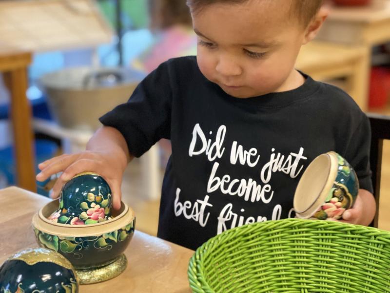 Within the Montessori classroom, natural materials are used whenever possible. We choose to provide children with wooden bowls, glass dishes, and wicker baskets because these materials are more sensory-rich than plastic. Natural materials feel interesting and different from one another. Children, especially toddlers, are exploring the world with all their senses. They are categorizing their discoveries and refining their abilities to gain information about the world around them. In an environment filled with plastic objects, a child has a harder time classifying and exploring objects. A plastic doll feels, smells, looks, sounds and tastes the same as a plastic spoon, a plastic block, and a plastic banana. If you provide your child with a fabric doll, a metal spoon, a wooden block, and a real-life banana, you are allowing him to explore with her senses the differences between these objects.